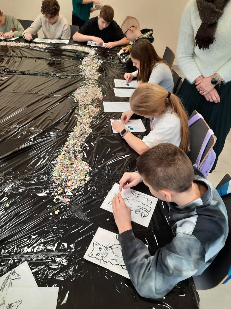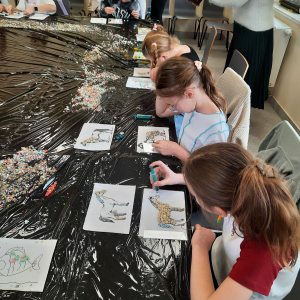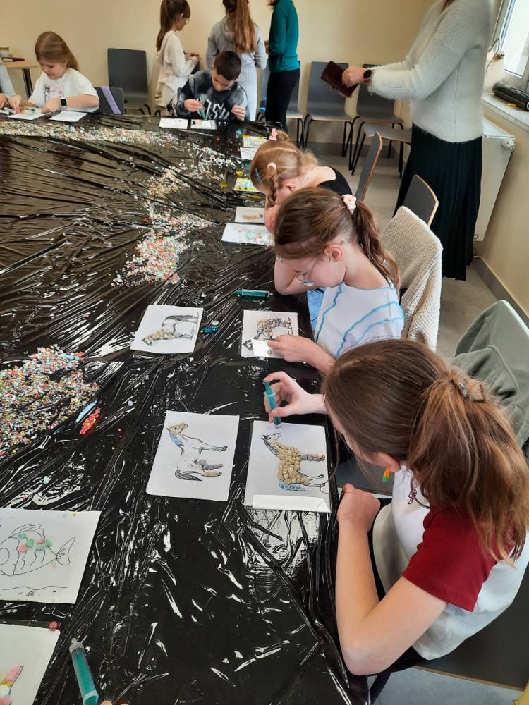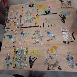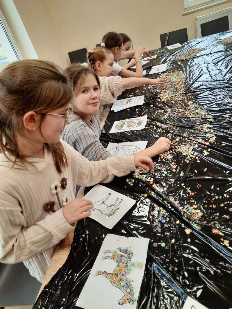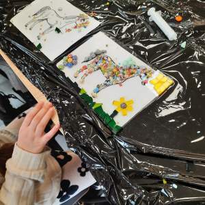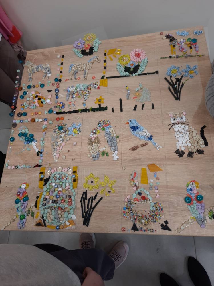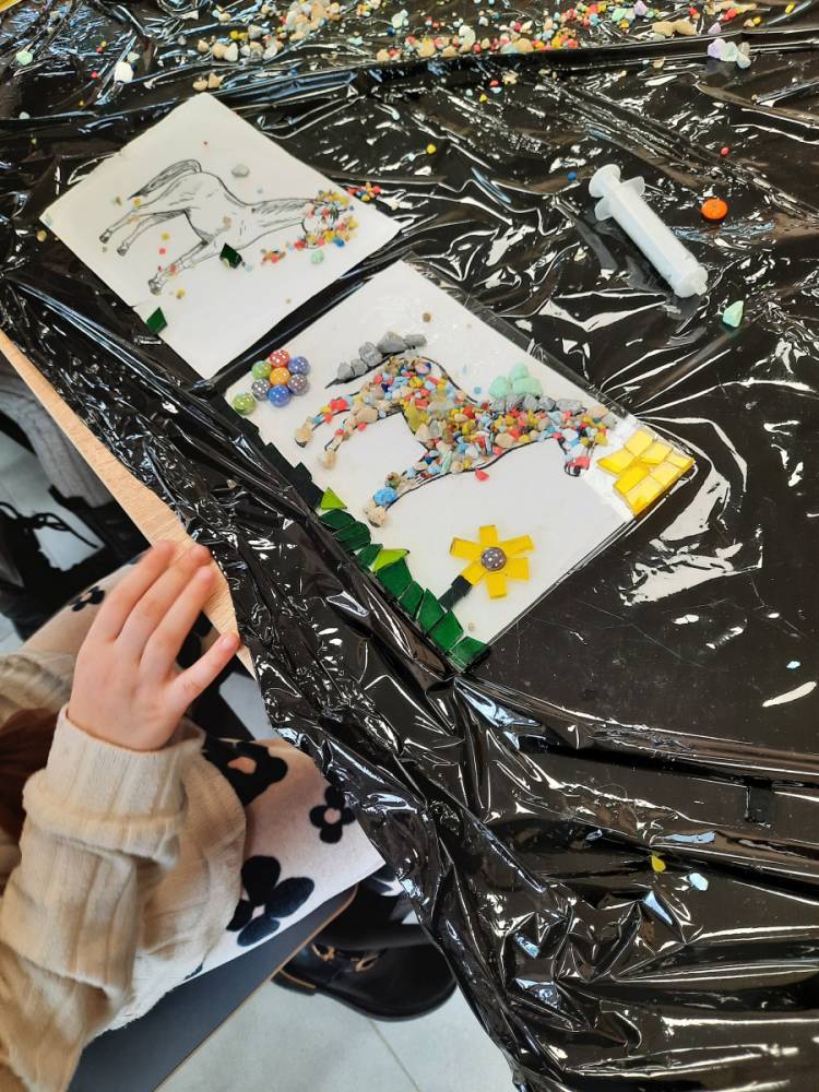 - Warsztaty z Mozaiki szklanej – dzieci zaprojektowały swoje własne wzory, wybierając kolory i kształty szklanych elementów. Dzieci układały i kleiły szklane elementy, tworząc piękne, kolorowe kompozycje.