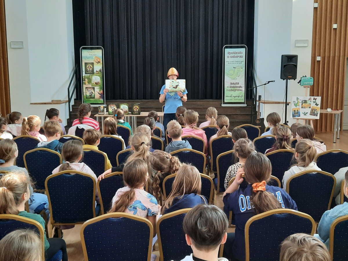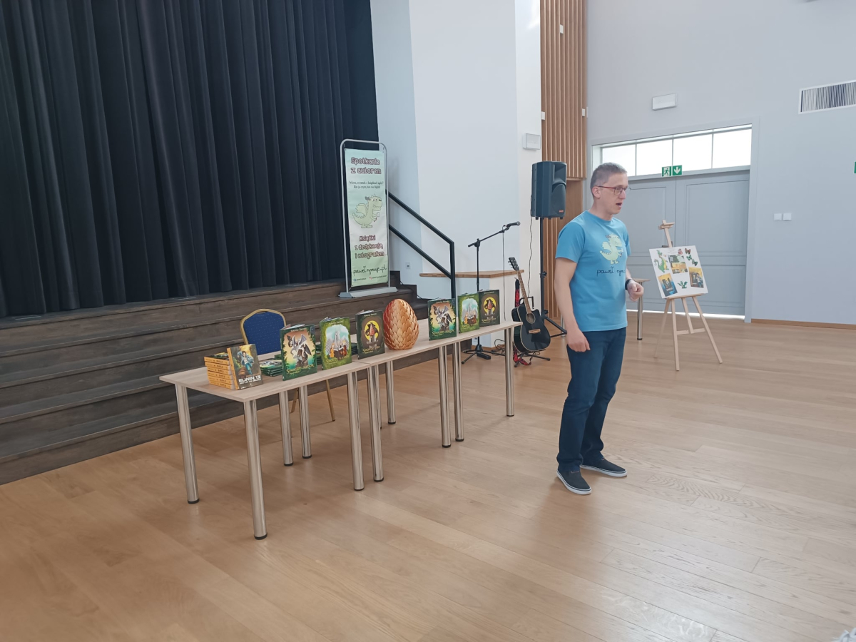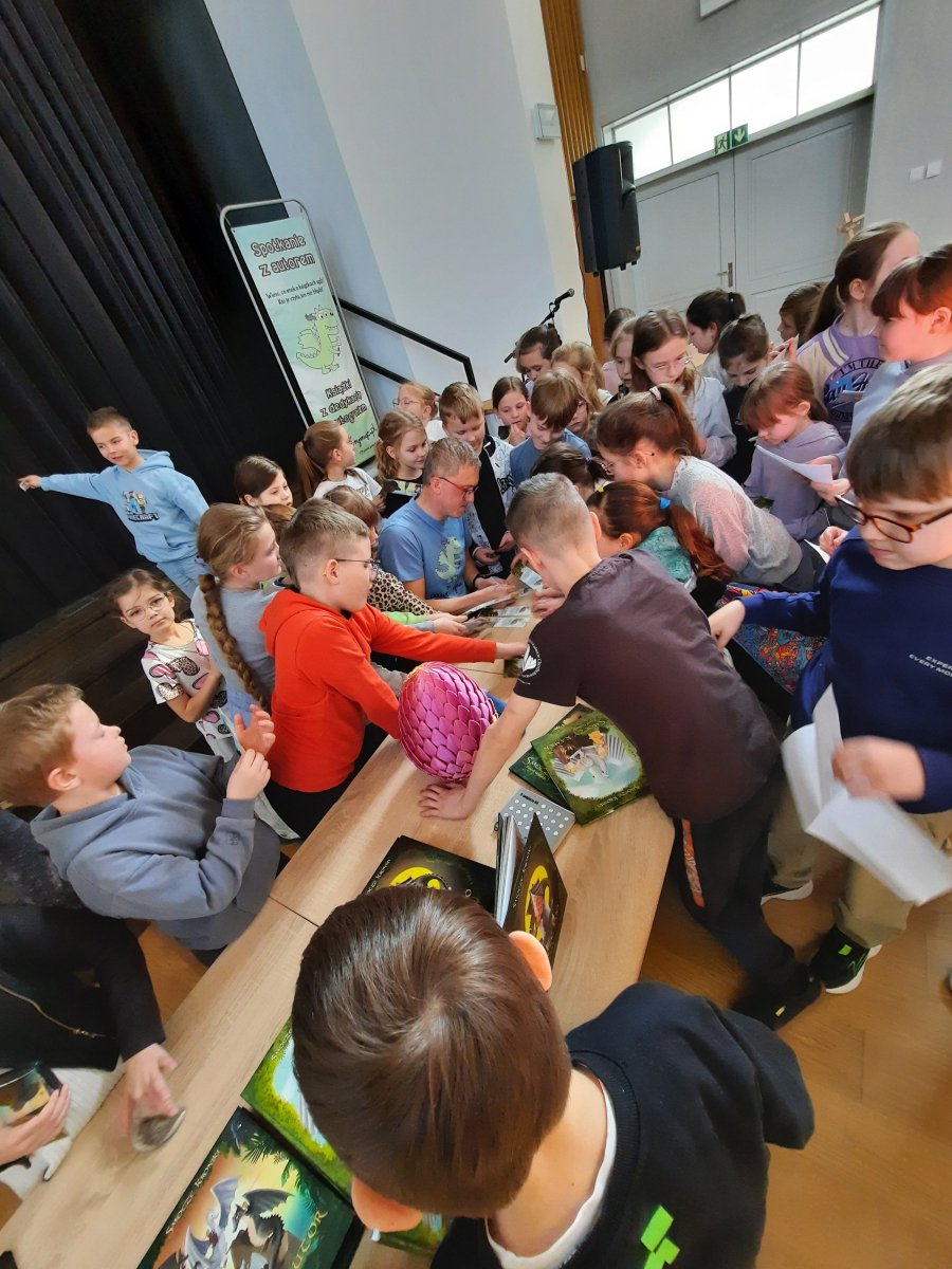 W związku z zbliżającym się Dniem Poezji, dnia 19 marca mieliśmy zaszczyt gościć pana Pawła Gołucha, znanego pisarza i autora wielu wspaniałych książek dla dzieci i młodzieży takich jak „Smocze Kroniki” i „Elwin 13”. Pan Paweł opowiadał o swoich książkach, inspiracjach i procesie twórczym. Uczniowie mieli okazję dowiedzieć się więcej o pracy pisarza i usłyszeć fragmenty jego książek. Spotkania były bardzo ciekawe i inspirujące. Atmosfera była miła i swobodna, a wszyscy uczestnicy byli bardzo zadowoleni. Na zakończenie każdy uczestnik dostał od autora zakładkę do książek, na której autor mógł złożyć swój autograf oraz dzieci mogły zakupić książki z dedykacją i smocze poduszki autora!